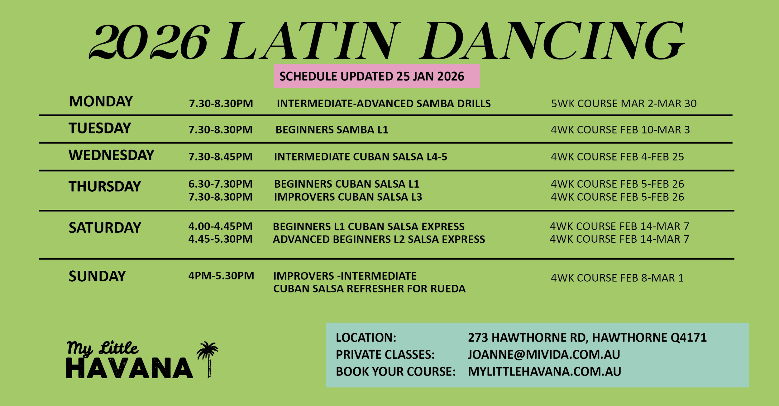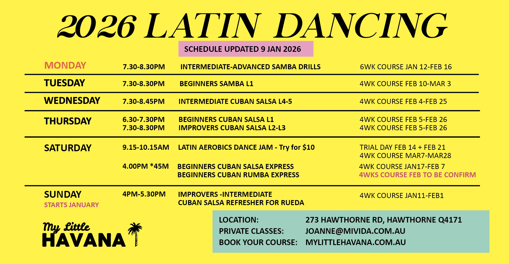 We mostly use the latest Cuban Salsa for Cuban dance classes, Brazilian Samba for Samba classes and upbeat Latin Music during the exercise classes. We always aim to create an enjoyable dance atmosphere but at the same time, we are welcome to feedback on the type of music you like to hear.