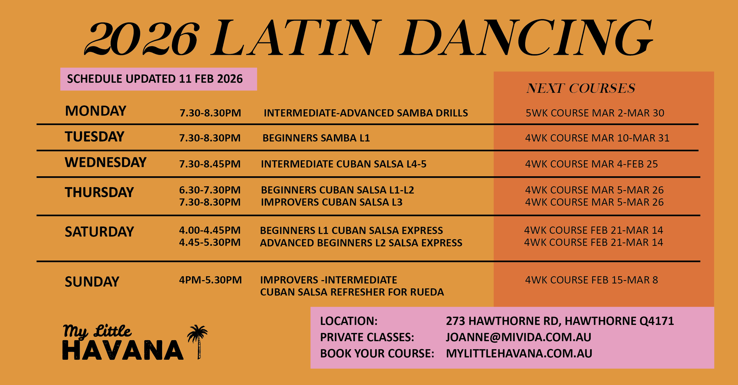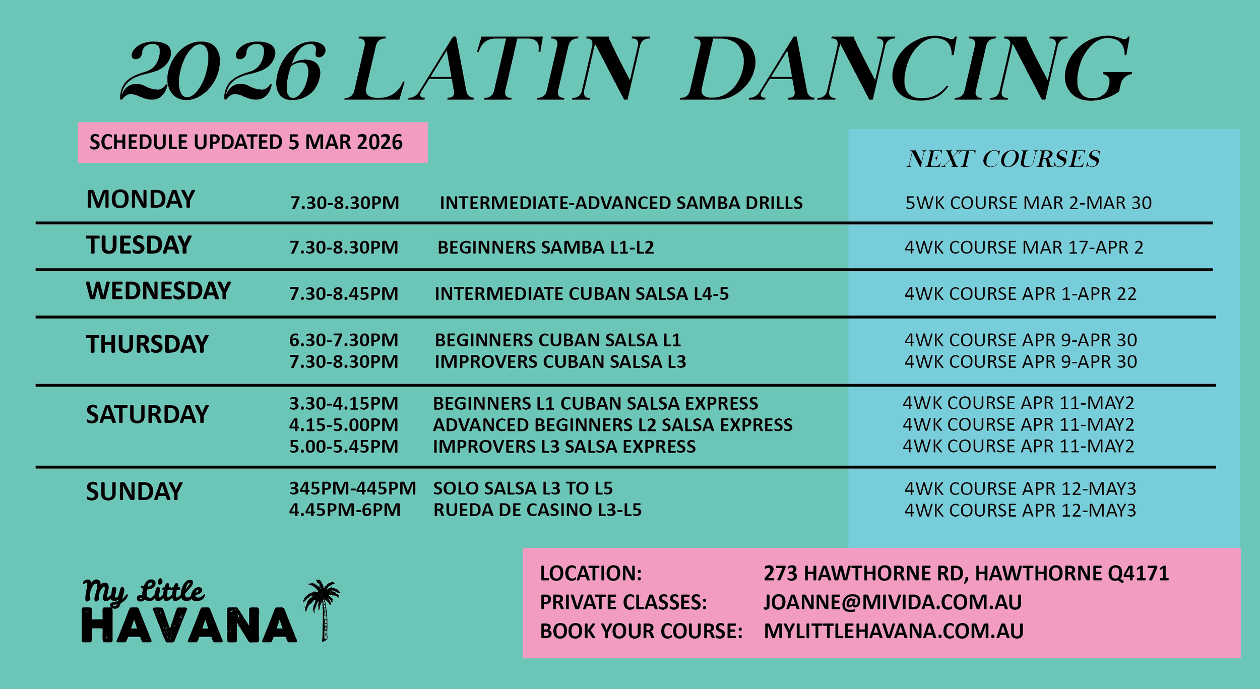 You can easily sign up for Latin dance classes using our website home page or send us an email at joanne@mivida.com.au; or send us an SMS or give us a call on 0410 042 685. Jo Anne will be happy to assist you in finding the right class for your dance skill levels and help you get started.